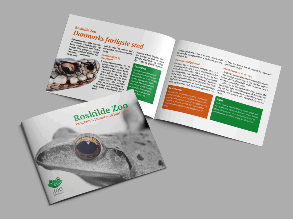 Denne programfolder er udviklet som en del af et konceptuelt projekt for Roskilde Zoo. Formålet var at skabe en informativ og visuelt engagerende folder, der kunne præsentere programmets aktiviteter på en overskuelig og inspirerende måde.